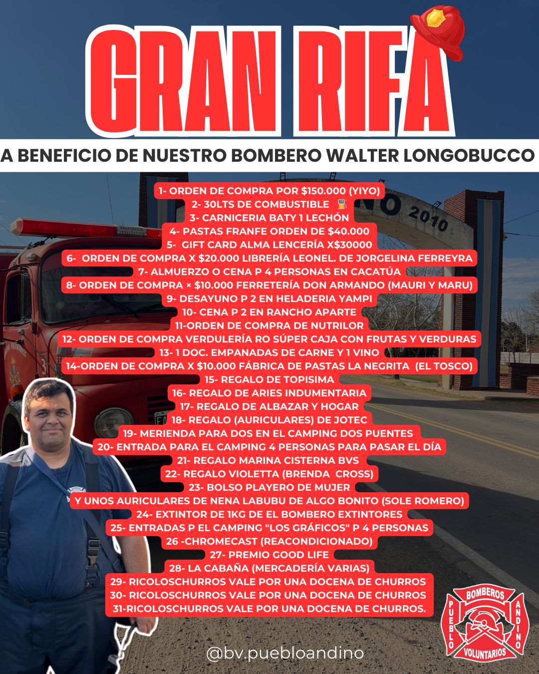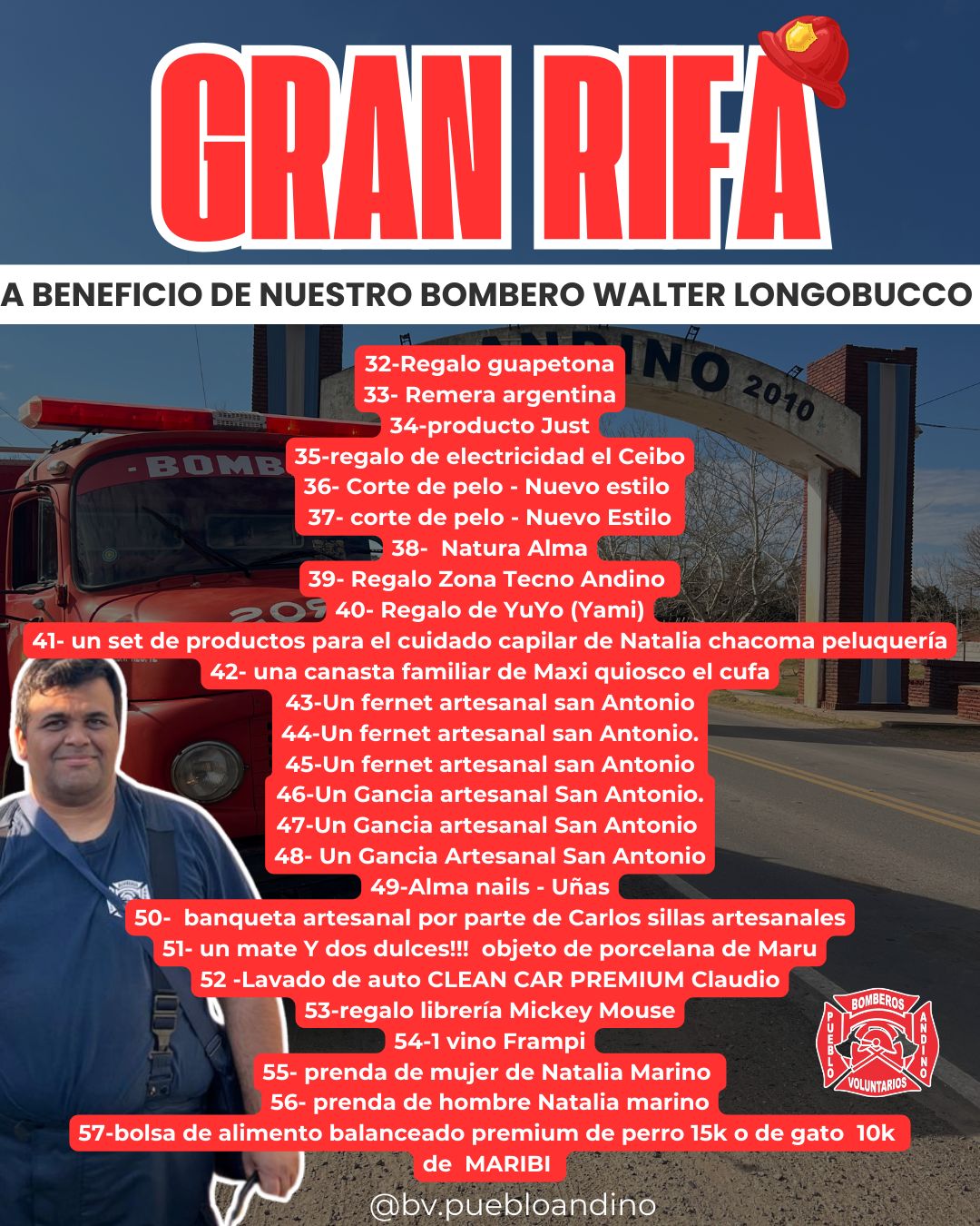 Los Bomberos Voluntarios de Pueblo Andino lanzaron una gran rifa solidaria con el objetivo de recaudar fondos para colaborar con su compañero Walter Longobucco, quien fue diagnosticado con leucemia.