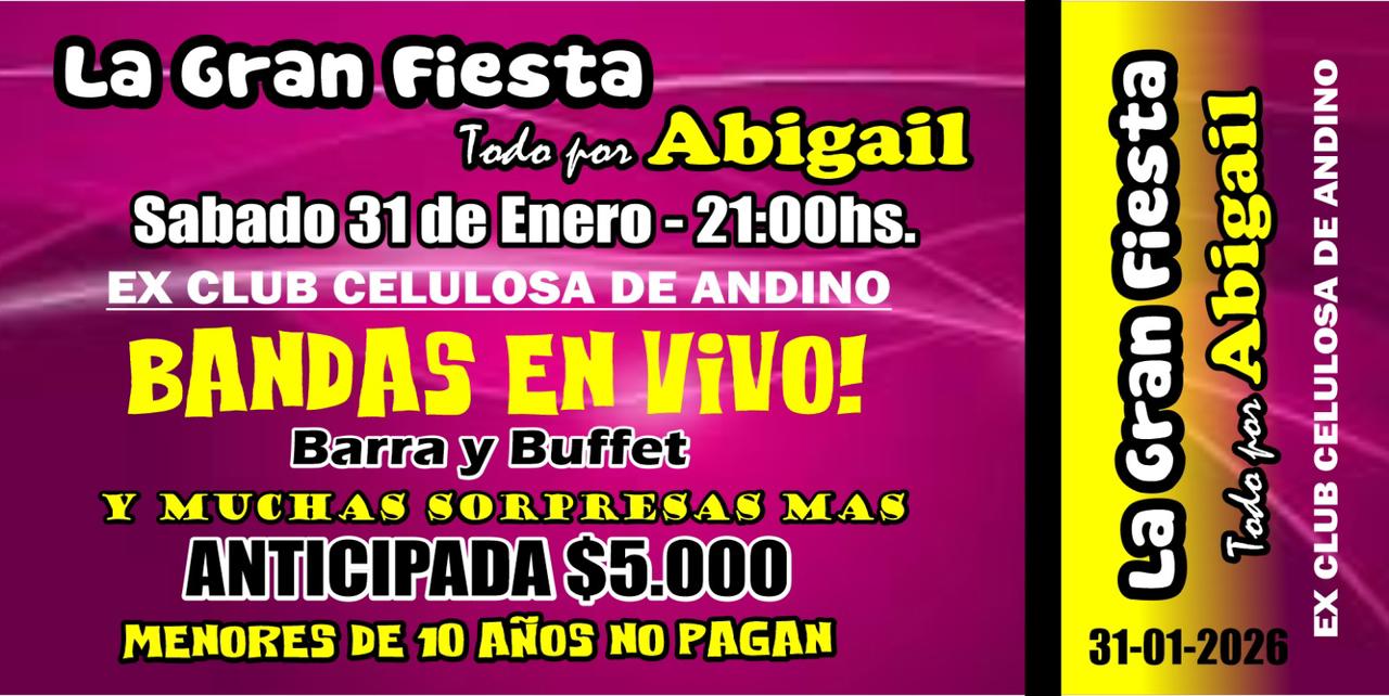 El próximo sábado 31 de enero, a partir de las 21 horas, se realizará en Ex Club Celulosa de Andino una gran fiesta solidaria bajo el lema “Todo por Abigail”, con el objetivo de colaborar y acompañar a la familia de la pequeña.