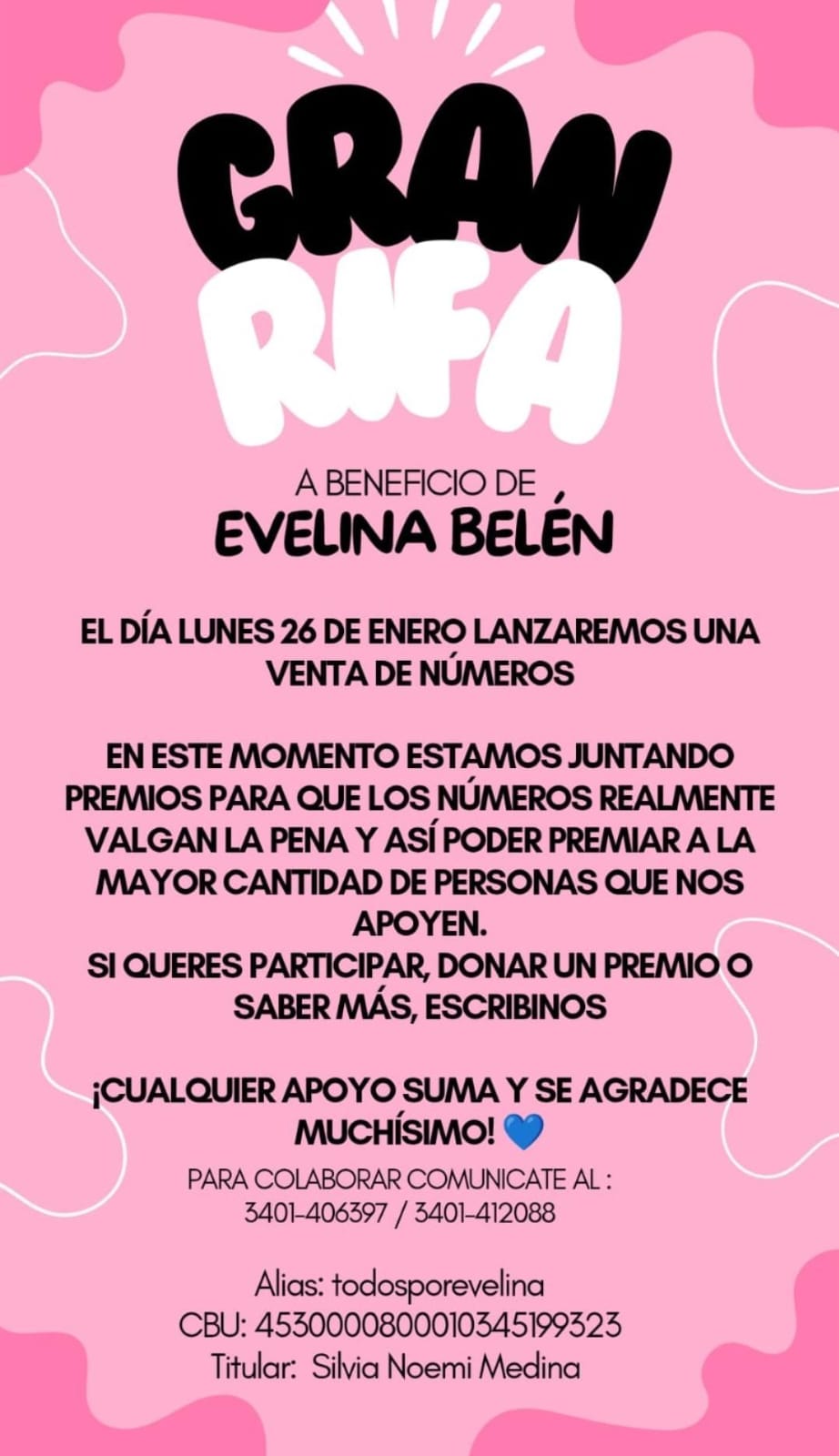 Quienes deseen participar, donar premios o colaborar de cualquier manera pueden comunicarse a los teléfonos 3401-406397 o 3401-412088. También se encuentra habilitado el alias todosporevelina, a nombre de Silvia Noemí Medina, para recibir aportes solidarios. Cada ayuda suma y resulta fundamental para acompañar a Evelina y su familia en este difícil momento.