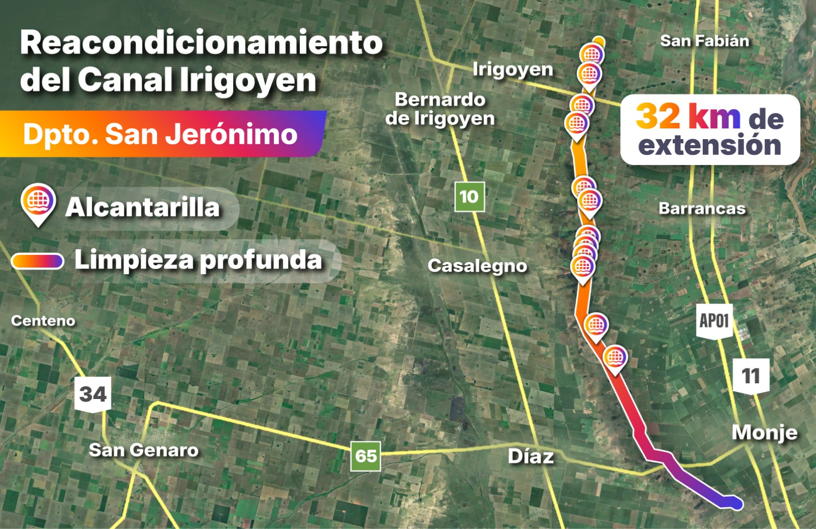En paralelo, la Provincia continúa desarrollando obras hídricas en el departamento San Jerónimo. Actualmente avanza la limpieza de 10 kilómetros del canal principal San Eugenio y, junto a la Municipalidad de Gálvez, se completó la limpieza de 17 kilómetros del Canal Los Llanos, mejorando los escurrimientos urbanos y rurales.