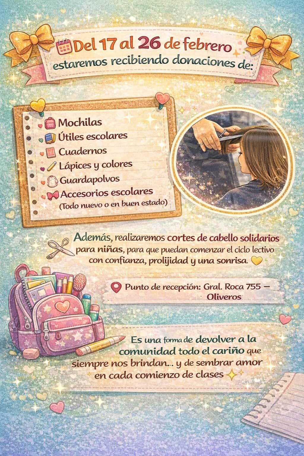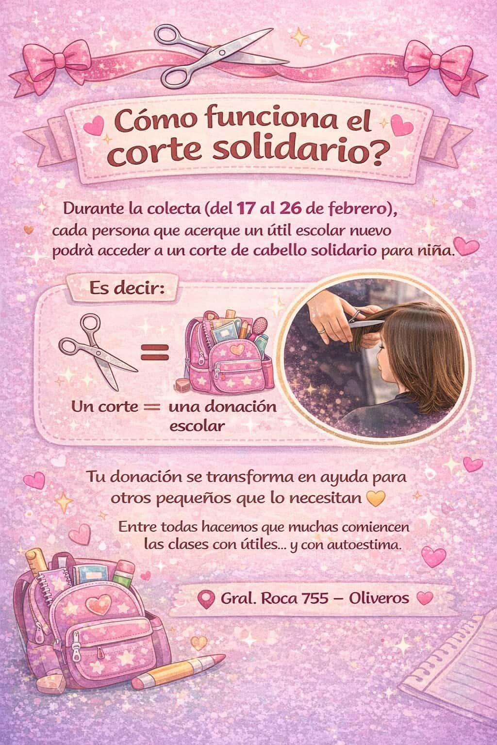 Durante esos días, el salón ofrecerá cortes de cabello para niñas y adolescentes en edad escolar a cambio de la donación de un útil escolar. Se podrán acercar mochilas, cuadernos, lápices, colores, guardapolvos y otros artículos nuevos o en buen estado. Todo lo recolectado será destinado a familias de la localidad que necesiten apoyo para afrontar los gastos del comienzo de clases.