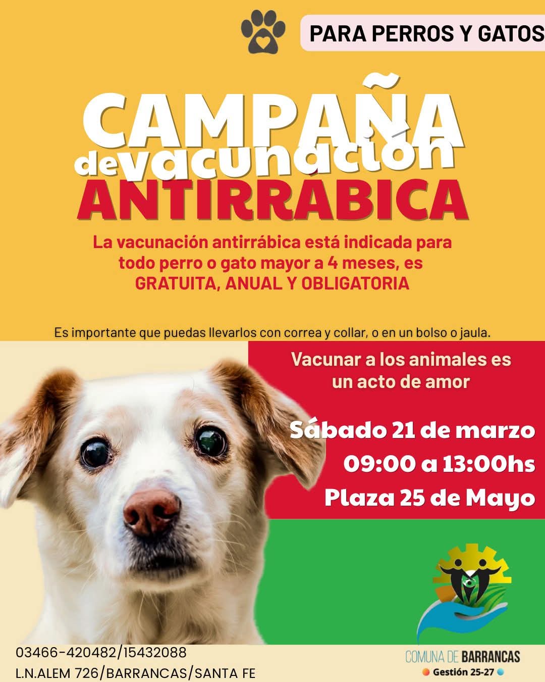 La Comuna de Barrancas llevará adelante una nueva campaña de vacunación antirrábica destinada a perros y gatos mayores de cuatro meses. La jornada se desarrollará el sábado 21 de marzo, de 9 a 13 horas, en la Plaza 25 de Mayo.