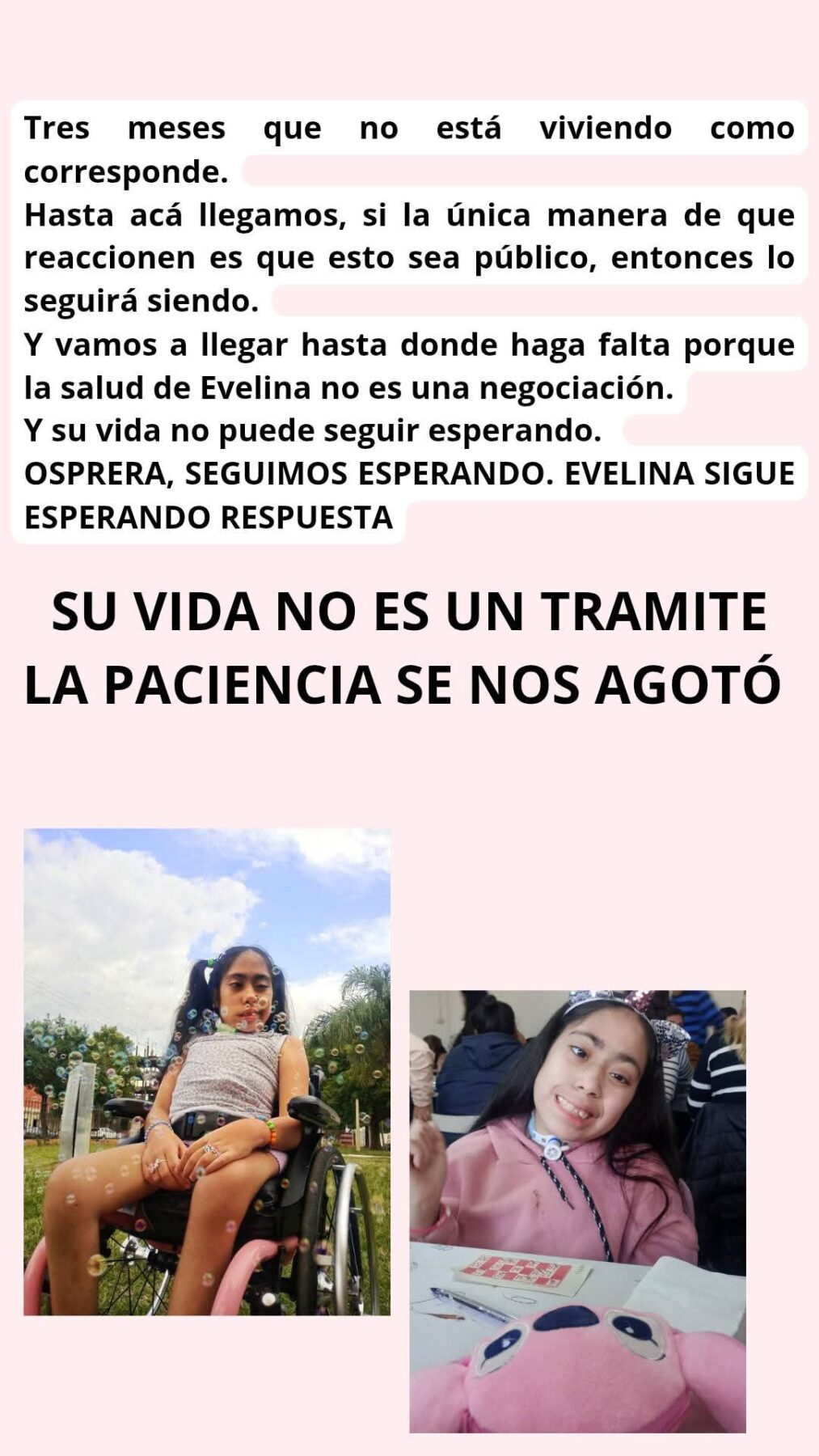 Para poder volver a casa y tener una mejor calidad de vida, necesita contar con insumos médicos muy costosos, especialmente un respirador y otros elementos indispensables para mis cuidados diarios. «Lamentablemente, la obra social (OSPRERA) se está atrasando mucho», lamentó su familia.