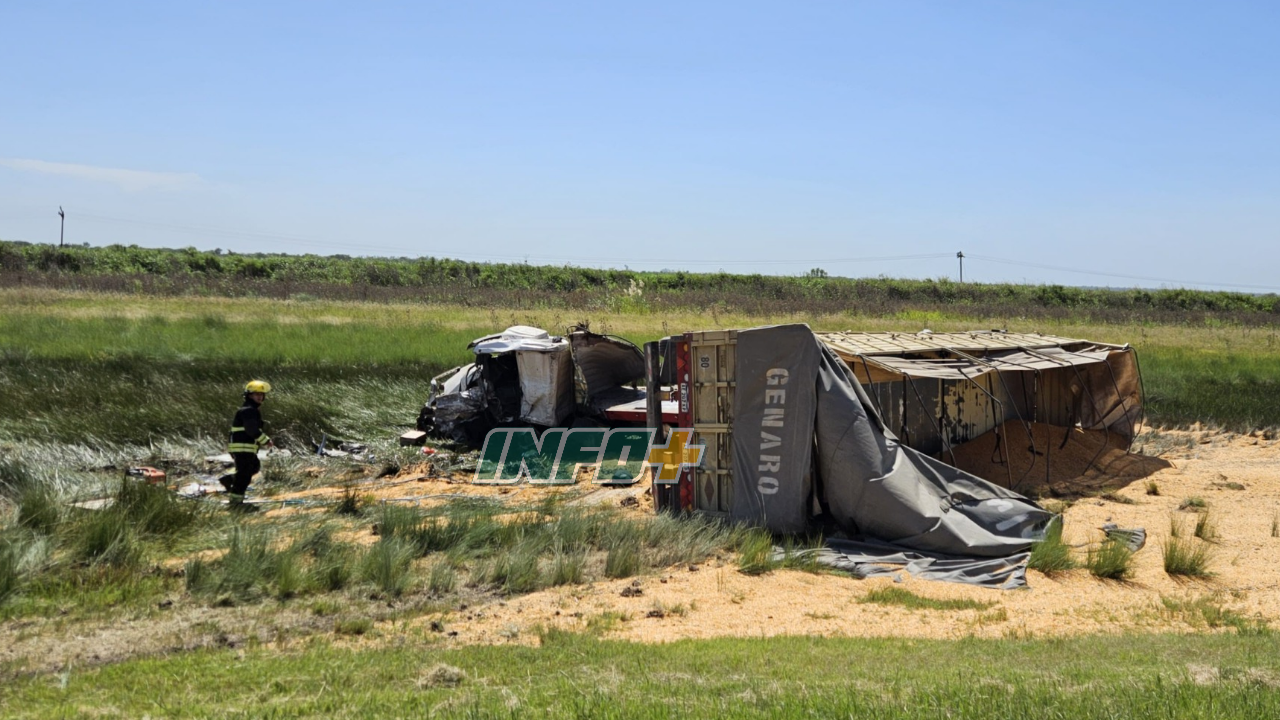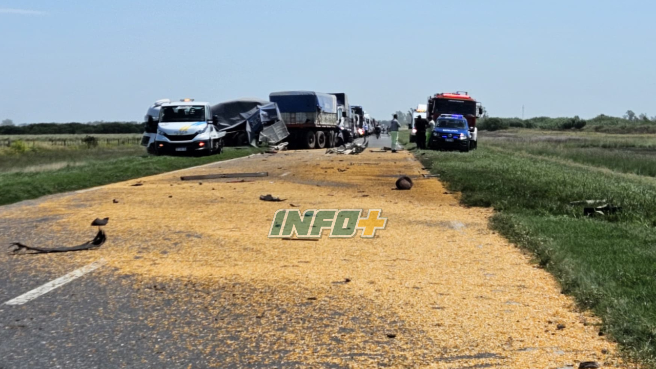 Uno de los camiones quedó en la banquina y otro sobre la ruta, cuya carga terminó esparcida sobre la calzada, causando el corte total.