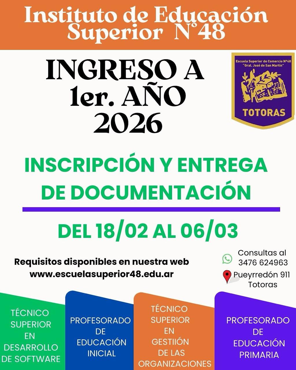 El Instituto de Educación Superior de la Escuela Superior de Comercio N° 48 “Gral. José de San Martín” de la ciudad de Totoras mantiene abierta la inscripción a primer año para el ciclo lectivo 2026. La propuesta académica incluye una variada oferta de carreras de formación técnica y docente, con orientación a la inserción laboral y al desarrollo educativo.