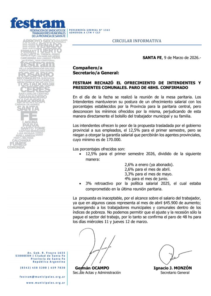 La Federación de Sindicatos de Trabajadores Municipales de la Provincia de Santa Fe (Festram) confirmó un paro de 48 horas que afectará a municipios y comunas de toda la región. La medida de fuerza fue anunciada luego de que el gremio rechazara la propuesta salarial presentada por intendentes y presidentes comunales en el marco de la mesa paritaria.