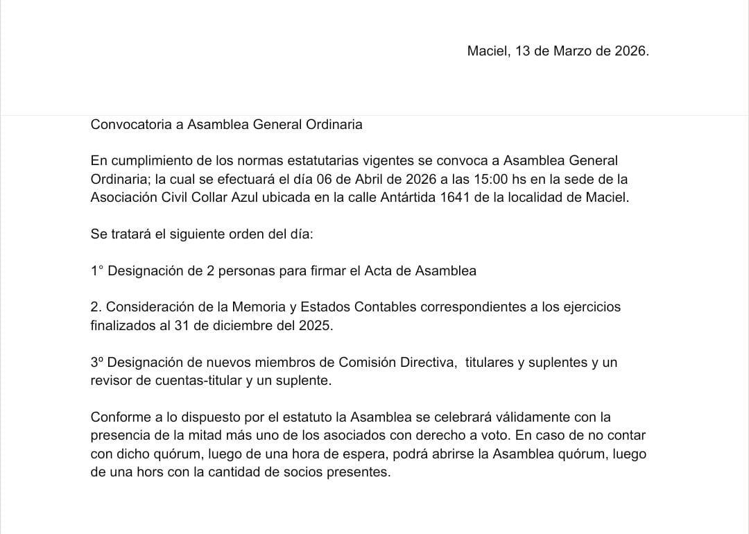 La Asociación Civil Collar Azul de la localidad de Maciel convocó formalmente a sus asociados a participar de la Asamblea General Ordinaria que se realizará el próximo 6 de abril de 2026 a las 15:00 horas en la sede de la institución, ubicada en Antártida 1641.