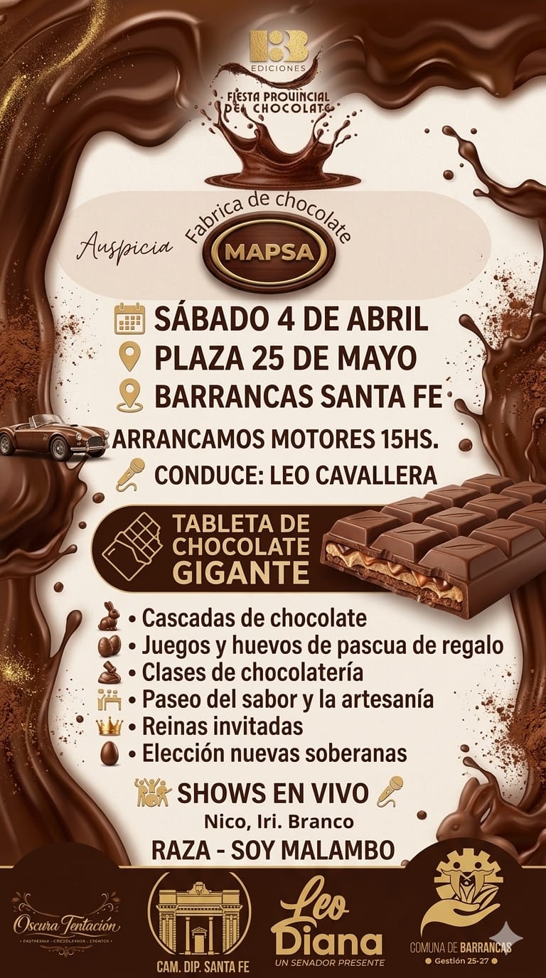 La Fiesta Provincial del Chocolate se celebrará el Sábado de Gloria, (4 de abril ) víspera de Pascua, cada año. Esta 13° edición no es una más, porque retoman la total organización, sus creadoras, la pyme Oscura Tentación.