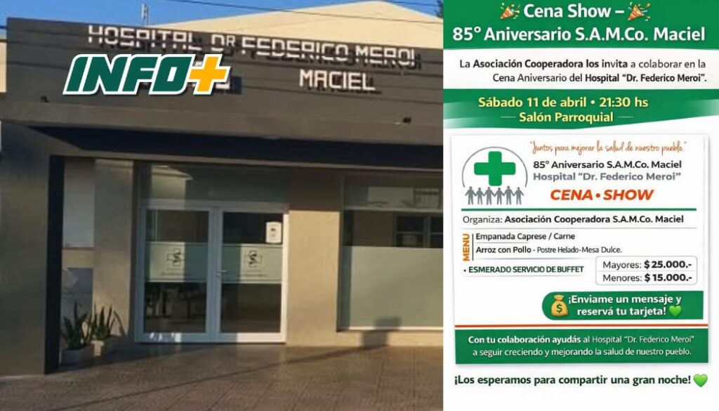 La Asociación Cooperadora del Hospital “Dr. Federico Meroi” invita a la comunidad a participar de la cena show organizada en el marco del 85° aniversario del S.A.M.Co. Maciel, un evento que busca recaudar fondos para continuar mejorando la atención de salud en la localidad.