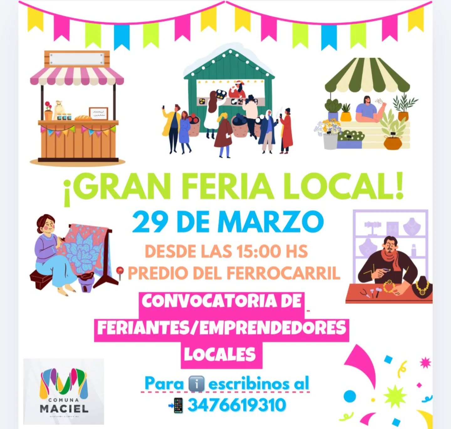 La Comuna de Maciel invita a la comunidad a participar de la Gran Feria Local, una propuesta que busca promover, visibilizar y fortalecer el trabajo de feriantes y emprendedores de la localidad. El evento se realizará el próximo 29 de marzo desde las 15:00 horas en el Predio del Ferrocarril, y estará abierto a todo el público.
