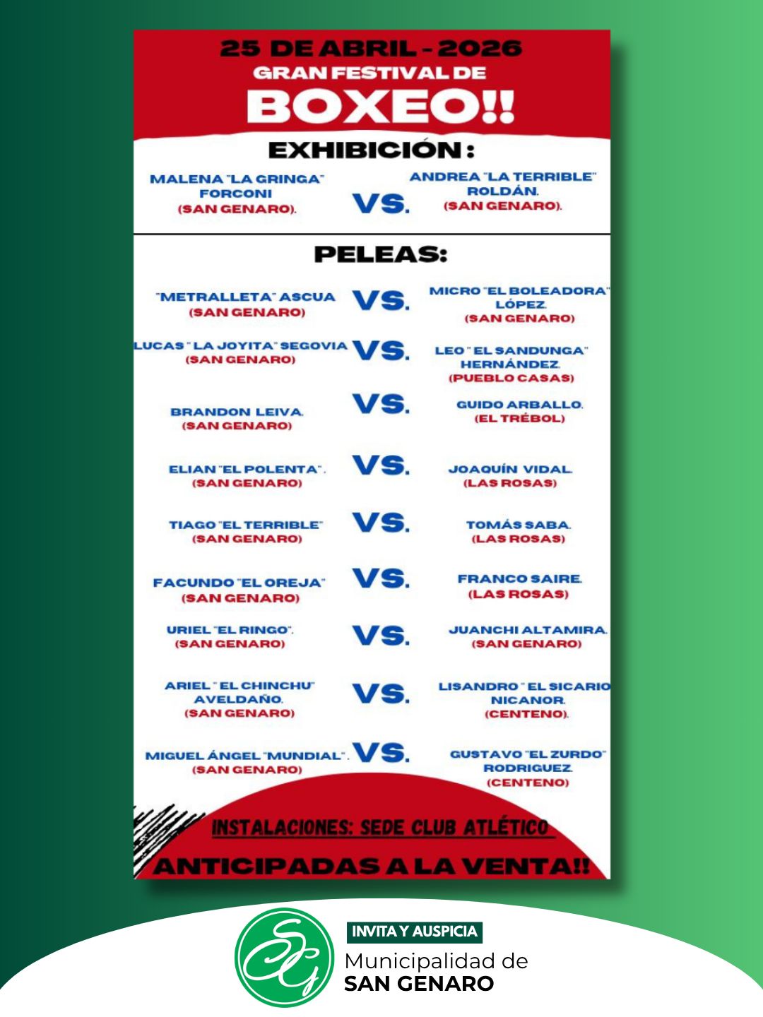 El programa de peleas incluirá varios combates entre boxeadores de San Genaro, Las Rosas, Centeno, Pueblo Casas y El Trébol. Entre los enfrentamientos anunciados se encuentran Metralleta Ascua contra Micro “El Boleadora” López; Lucas “La Joyita” Segovia frente a Leo “El Sandunga” Hernández; Brandon Leiva ante Guido Arballo; Elian “El Polenta” contra Joaquín Vidal; Tiago “El Terrible” frente a Tomás Saba; Facundo “El Oreja” ante Franco Saire; Uriel “El Ringo” frente a Juanchi Altamira; Ariel “El Chinchu” Aveldaño contra Lisandro “El Sicario” Nicanor; y Miguel Ángel “Mundial” frente a Gustavo “El Zurdo” Rodríguez.