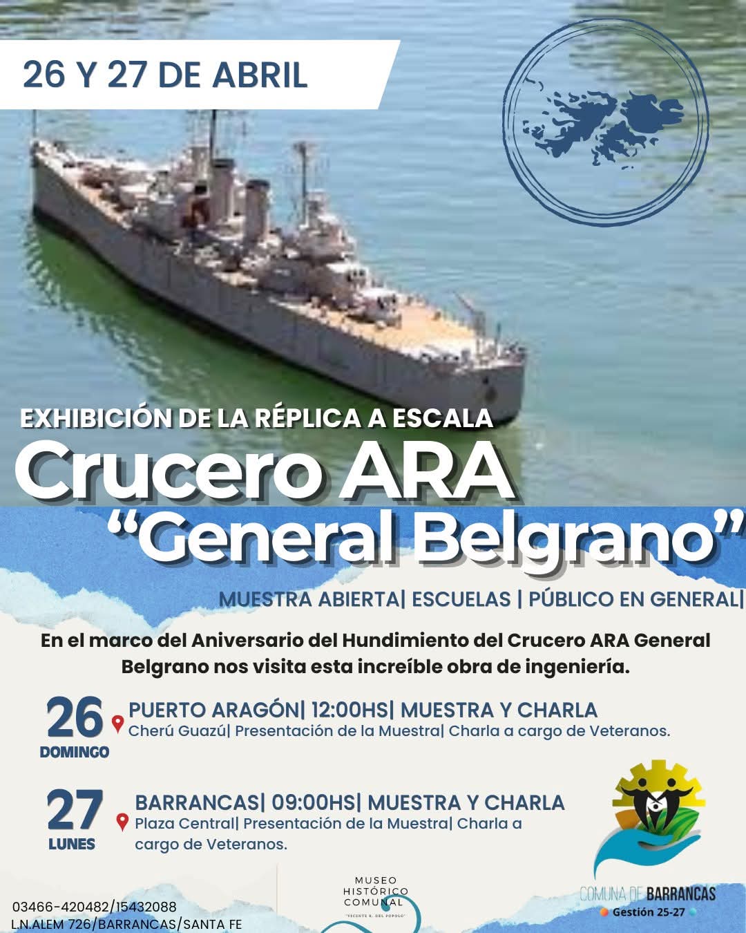 En el marco de un nuevo aniversario del hundimiento del Crucero ARA General Belgrano, ocurrido el 2 de mayo de 1982 durante la Guerra de Malvinas, se realizará una muestra abierta de su réplica a escala en la localidad de Barrancas.