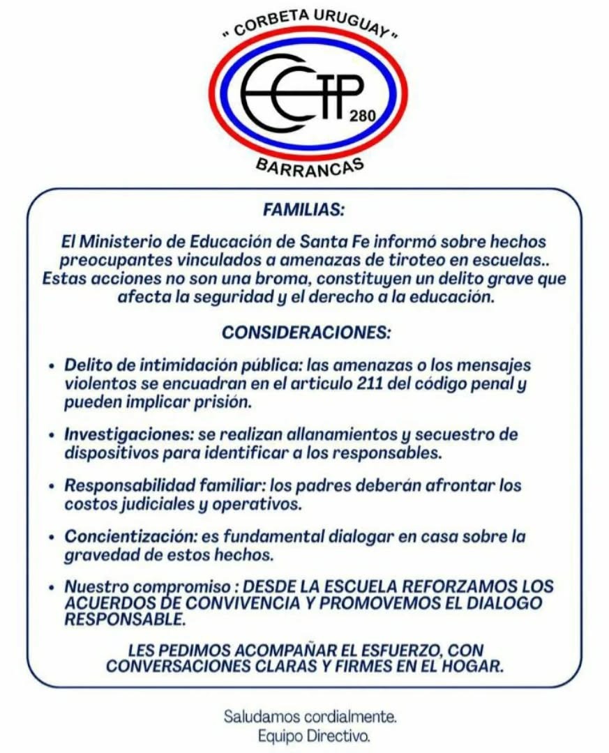 Desde la institución educativa emitieron un comunicado dirigido a las familias, en el que expresaron su preocupación por este tipo de situaciones y remarcaron la gravedad de las amenazas. En el mensaje, se señala que estos actos “no son una broma” y constituyen un delito que afecta la seguridad y el derecho a la educación.