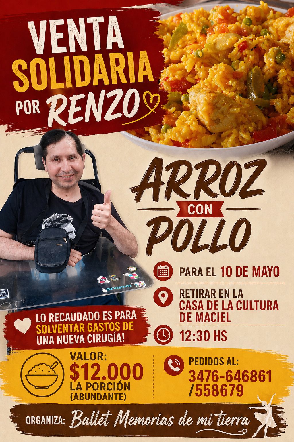 El macielense Renzo Zelada debe afrontar una nueva cirugía y cubrir sus gastos. Con ese objetivo, se organiza una venta de arroz con pollo, cuya recaudación será íntegramente destinada a cubrir los gastos médicos.