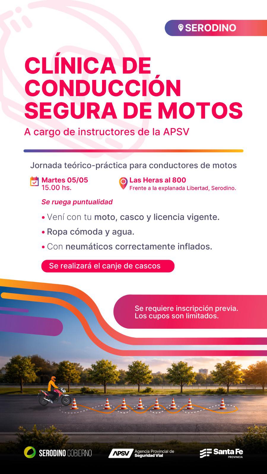 La localidad de Serodino llevará adelante una jornada de capacitación destinada a motociclistas, con el objetivo de promover una conducción más segura y responsable en la vía pública. La propuesta invita a vecinos y vecinas que utilizan moto a participar de una clínica teórico-práctica especialmente diseñada para reforzar conocimientos y hábitos de manejo.