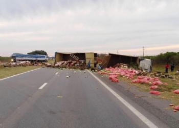 El acoplado de un camión junto a su carga quedó recostado arriba del puente la autopista Rosario Santa Fe, en ...